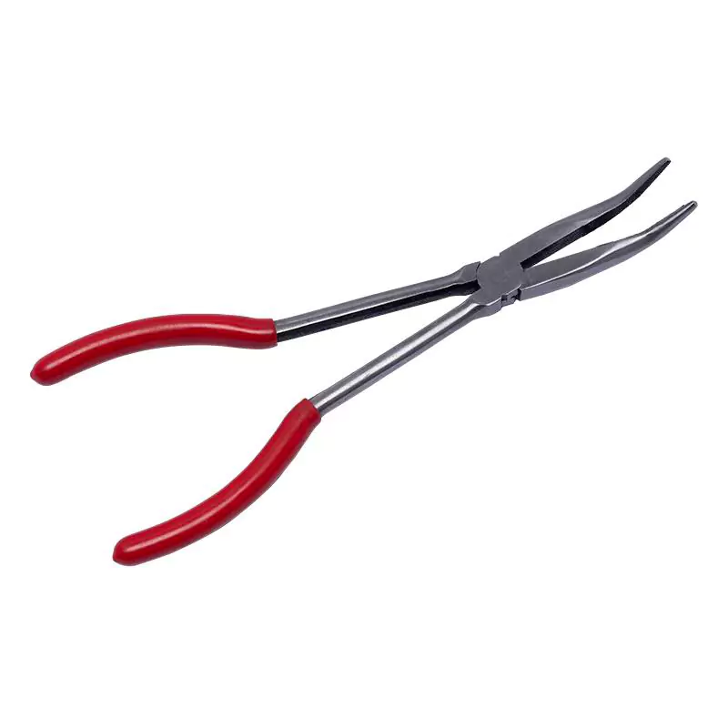 Bent nose pliers are hand tools with angled jaws that make gripping, pulling, and twisting easier in tight spaces. They are commonly used in fishing, jewelry making, electronics, and precision work. The bent design improves visibility and access, especially when working with small parts or hooks.