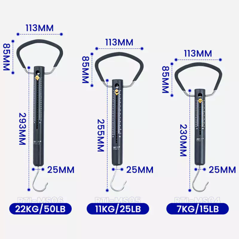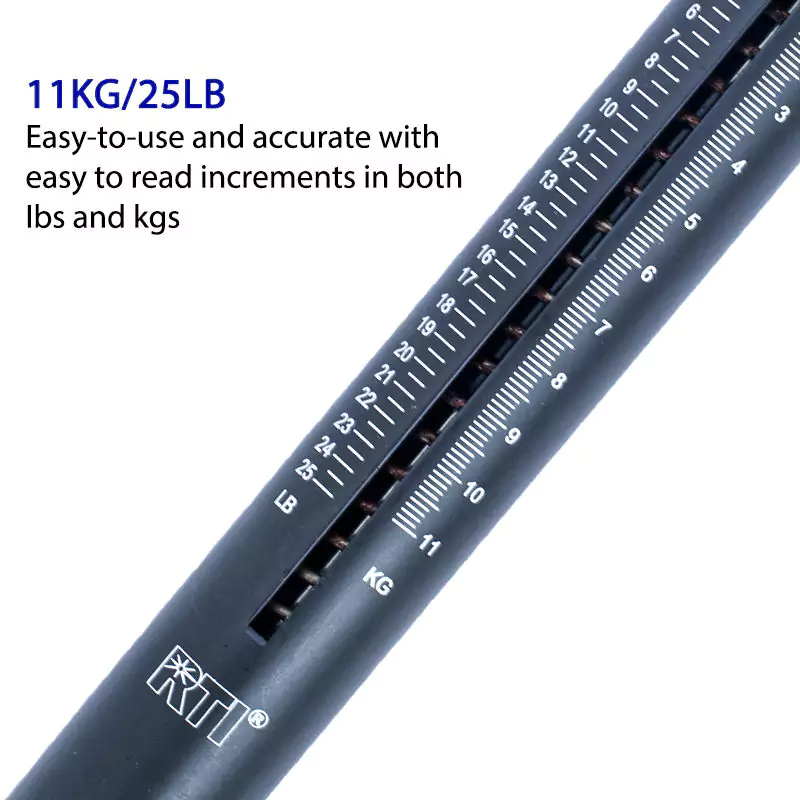 RTI’s Aluminum Tube Scale (RTI-MS05) is a 11KG / 25LB mechanical hanging scale designed for fishing and outdoor use. It pairs an anodized aluminum housing with stainless steel spring and hook. The handle is PVC-coated for a soft, non-slip grip.