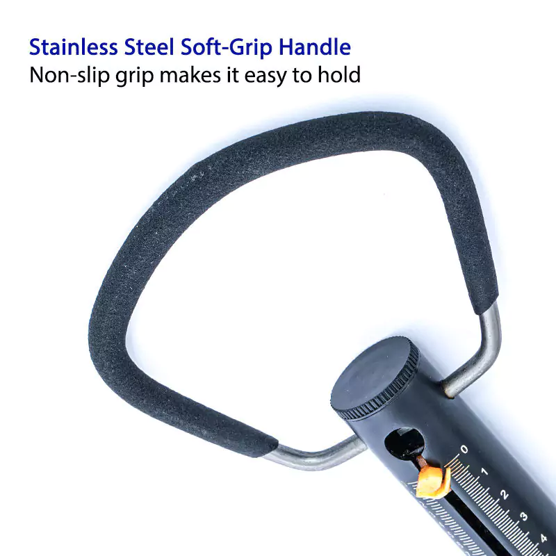 - Stainless Steel Soft-Grip Handle: The handle has a PVC-coated soft grip. It improves hold and reduces hand strain during weighing.