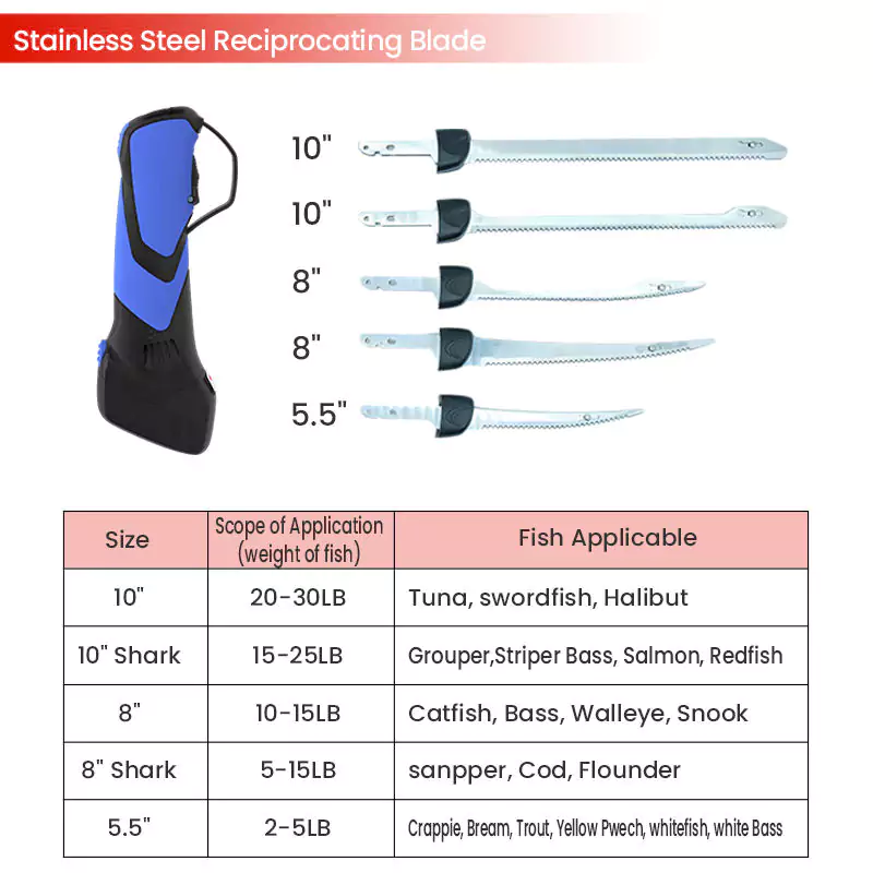 A1: Unlike standard electric knives, this model runs on dual rechargeable lithium-ion batteries, offering cordless freedom and longer cutting time. It also includes multiple blade sizes, making it suitable for both fish filleting and general food preparation.