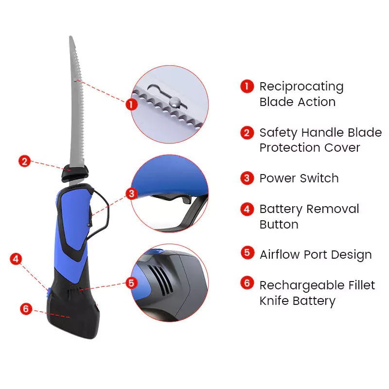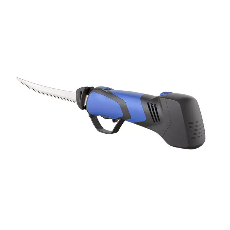 Lithium ion cordless fillet knife is a portable electric cutting tool powered by rechargeable batteries. Unlike traditional fillet knives, it uses reciprocating stainless steel blades to slice through fish, meat, or bread with speed and precision. The cordless design provides full freedom of movement, making it ideal for both kitchen and outdoor use.